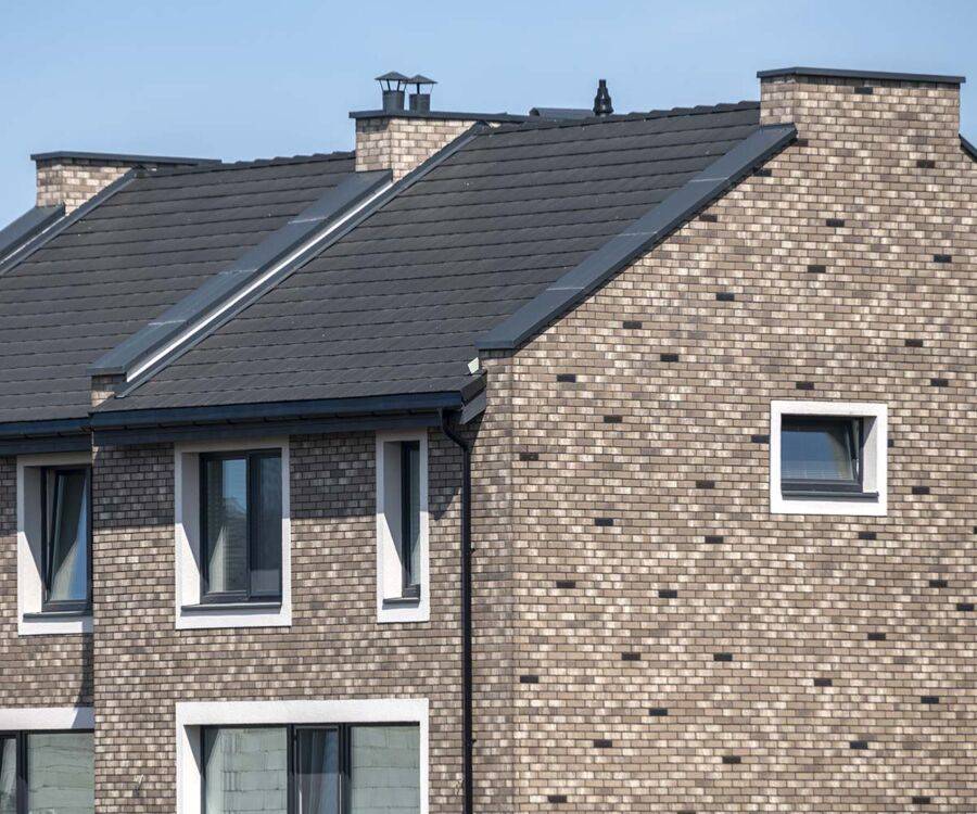 - Облицовочную. Имитирует другие материалы: черепицу, изразцы, бетон, кирпич, камень. Должна соответствовать всем необходимым эксплуатационным характеристикам, по сути функционал схож с фасадной: дополнительная зашита здания и украшение.