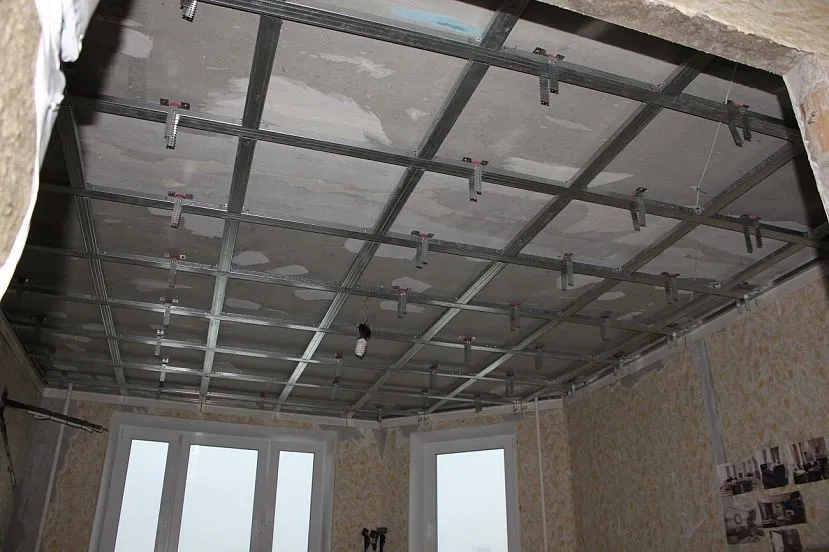 Каркасные системы. Изготавливается каркас из металлического профиля. Для этого по периметру потолка на расстоянии 10-15см крепятся направляющие рейки. При их креплении обязательно использовать демпфирующую звукоизоляционную прокладку между ними и стеной. Затем на специальных виброподвесах монтируется обрешетка и заполняется звукоизоляционными плитами минеральной, каменной или базальтовой ваты. Следующим слоем можно использовать акустическую мембрану. Полученная конструкция закрывается одним или двумя слоями гипсокартона