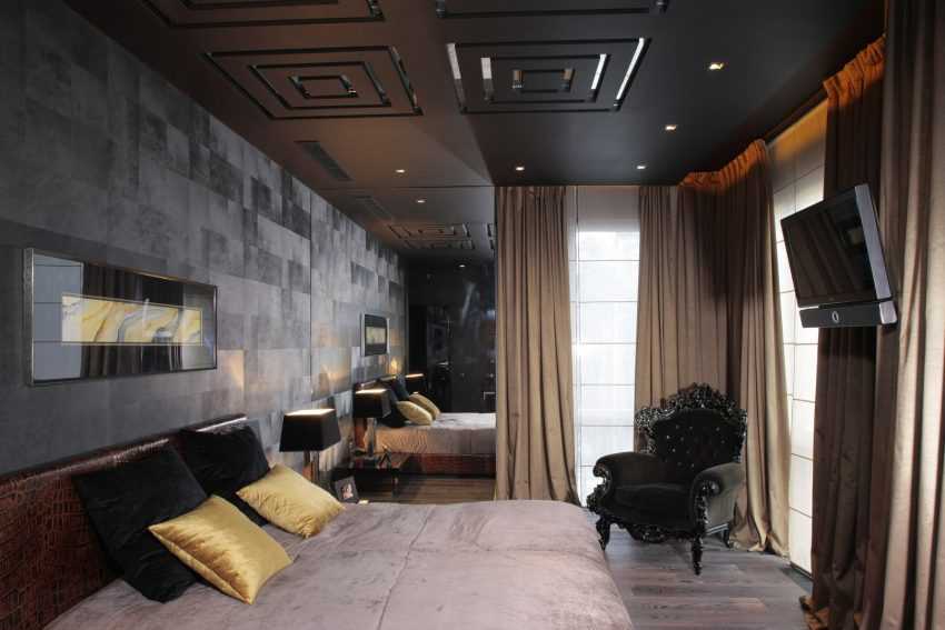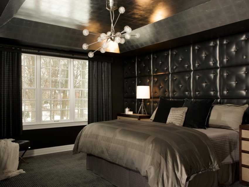 Иногда темную поверхность над головой совмещают со светлыми стенами. Но при этом спальню необходимо будет дополнить шторами и декором такого же благородного оттенка.