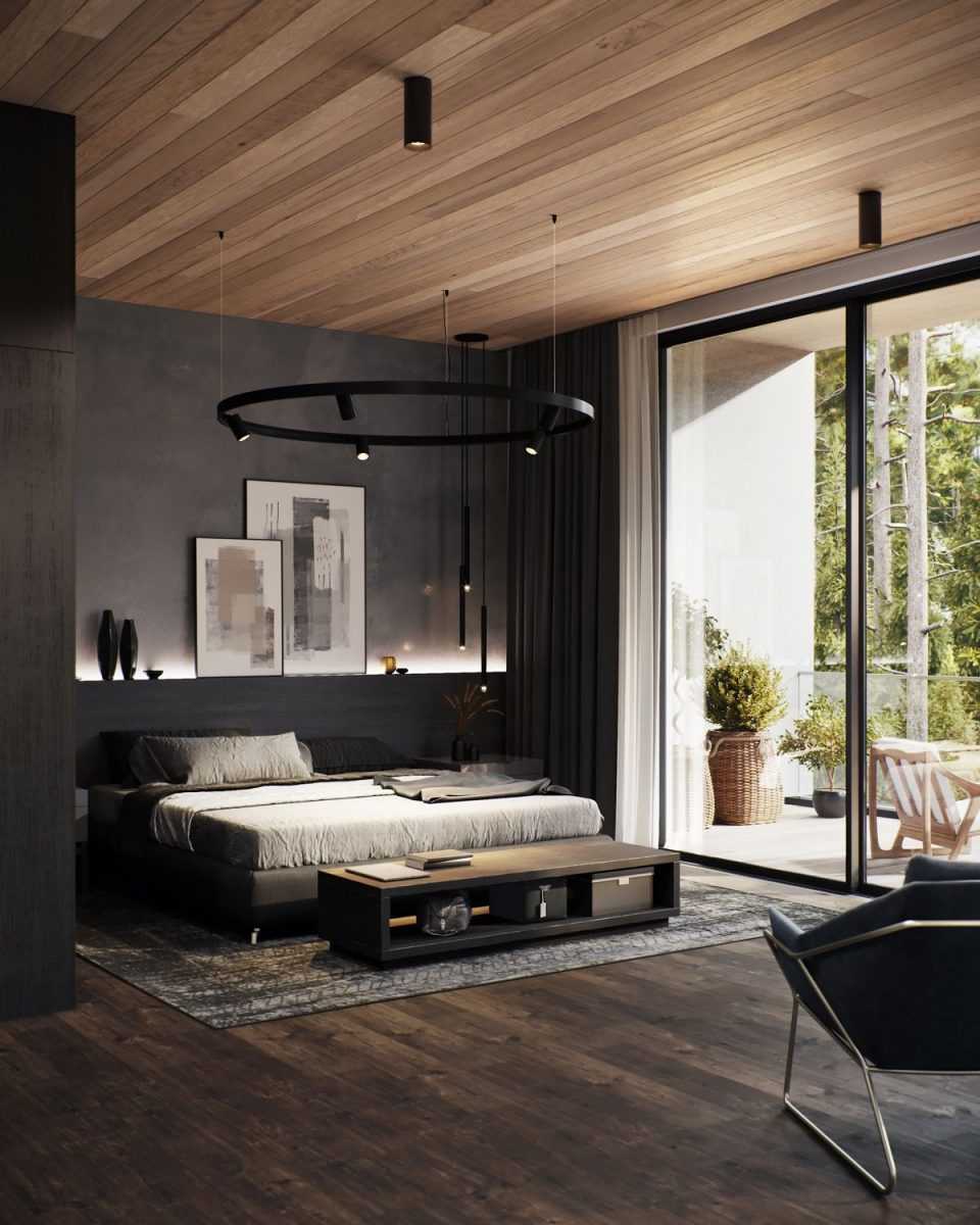 - Современный стиль — это направление позволяет себе чуть больше вольности, чем классика, но и здесь есть свои особенности. Цвет марсала в таком интерьере лучше миксовать с другими темными оттенками, деревом и геометрией в дизайне.