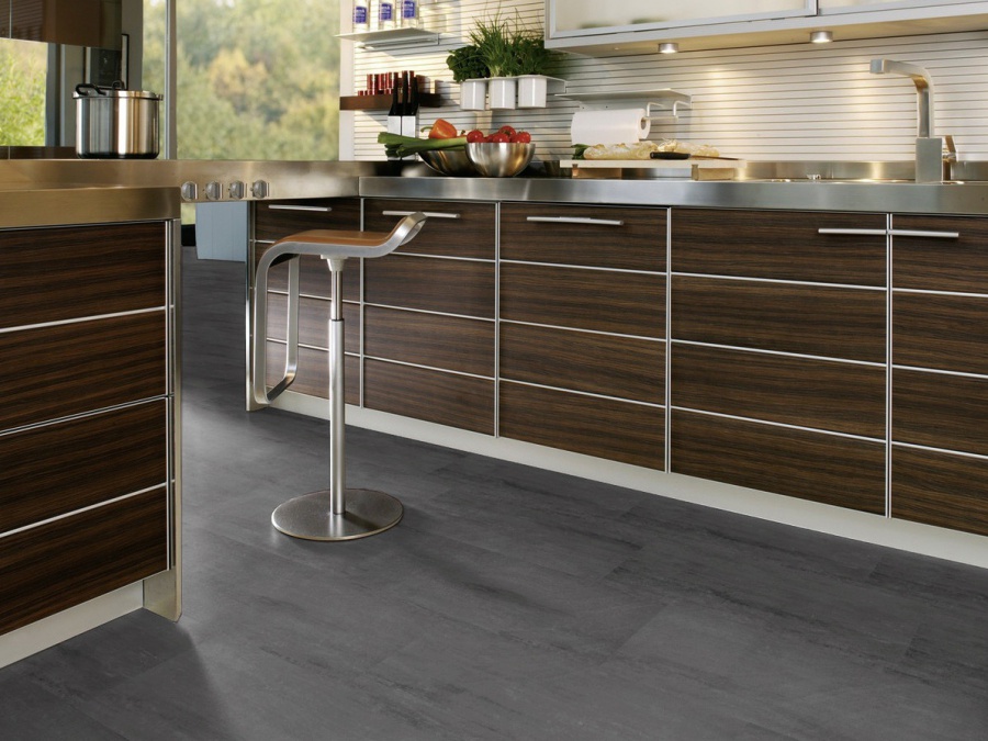 Единственный минус такого напольного покрытия заключается в вышеобозначенных функциональных сложностях: на темном полу хорошо заметна пыль и следы от ног.