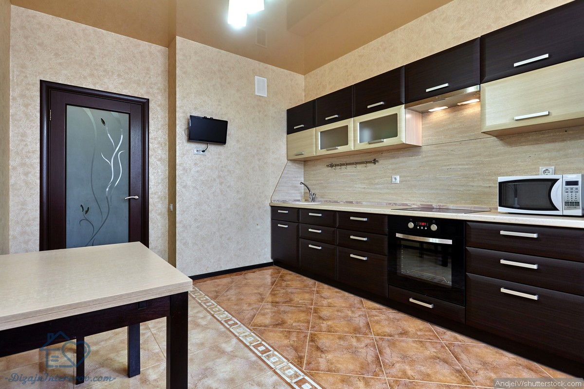 Подобное сочетание допустимо использовать только в больших по размеру кухнях с хорошим искусственным освещением и большими, пропускающими много солнечного света, оконными проемами.