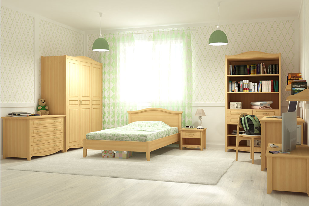 Для детской комнаты мебель в цветовом оттенке бука должна устанавливаться на светлом фоне. Актуальны для данного помещения бумажные обои салатового, розового, бежевого тонов. Они будут совершенно безопасны для здоровья малыша, и при этом очень красиво смотрятся с изделиями из бука. Яркие игрушки и фотографии на стенах дополнят дизайн, привнеся в него веселье и радость. Интерьер детской с мебелью цвета бук представляет вниманию читателя следующая фотография.