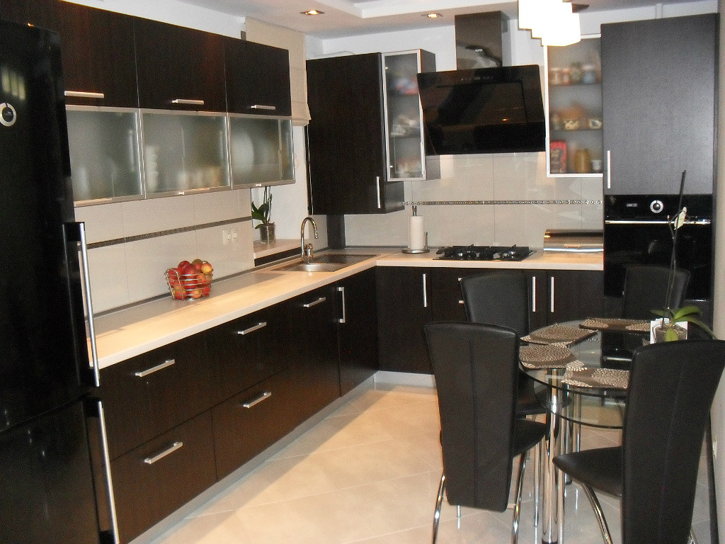 Оттенок венге универсален, его можно применять при декорировании различных кухонных составляющих. Кухонный гарнитур является самым популярным способом использования колера африканского палисандра. Мебель в такой гамме смотрится лаконично и даже аскетично.