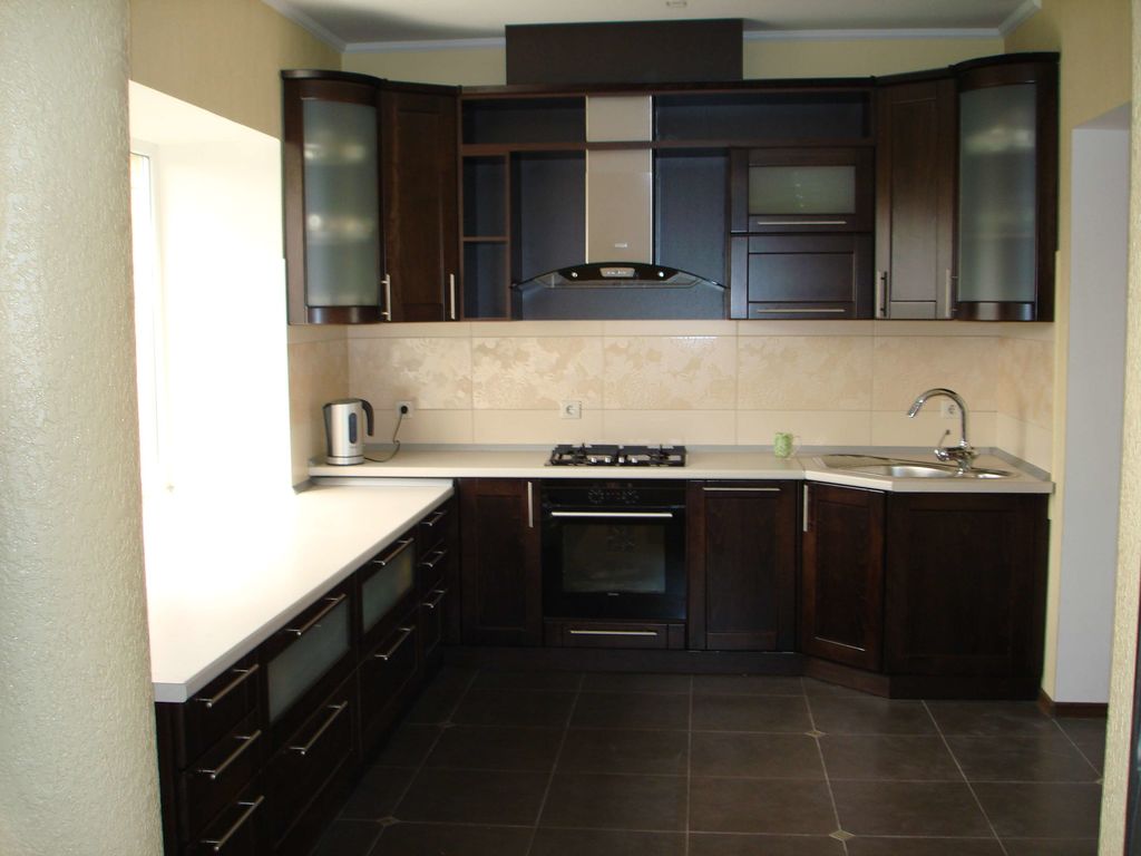 - Кухня в тонах венге уже считается классикой. Она придаёт помещению благородный вид. Здесь в сочетании с оттенками коричневого можно использовать витражи.