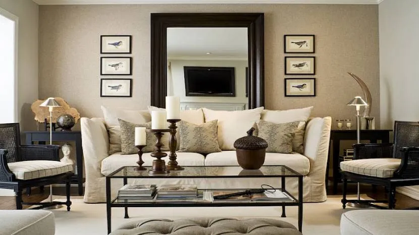 Зеркало в этом случае способно выполнять различные функции. С его помощью возможно легко и быстро расширить площадь, увеличить высоту потолков. Они очень выгодны с точки зрения привлекательности интерьера, но неправильное размещение может привести к противоположному эффекту и сделать гостиную непривлекательной. К примеру, постоянный повтор движения станет причиной постоянного отвлечения и раздражения.