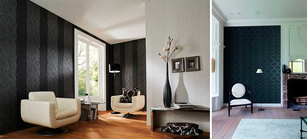 Помогут сбалансировать дизайн легкие штрихи в виде черных украшений отдельных участков комнаты, лучше напротив окна, обеспечивая им щедрое количество естественного света. Желательно, чтобы черные обои были не однотонными. Интересно выглядят следующие варианты: