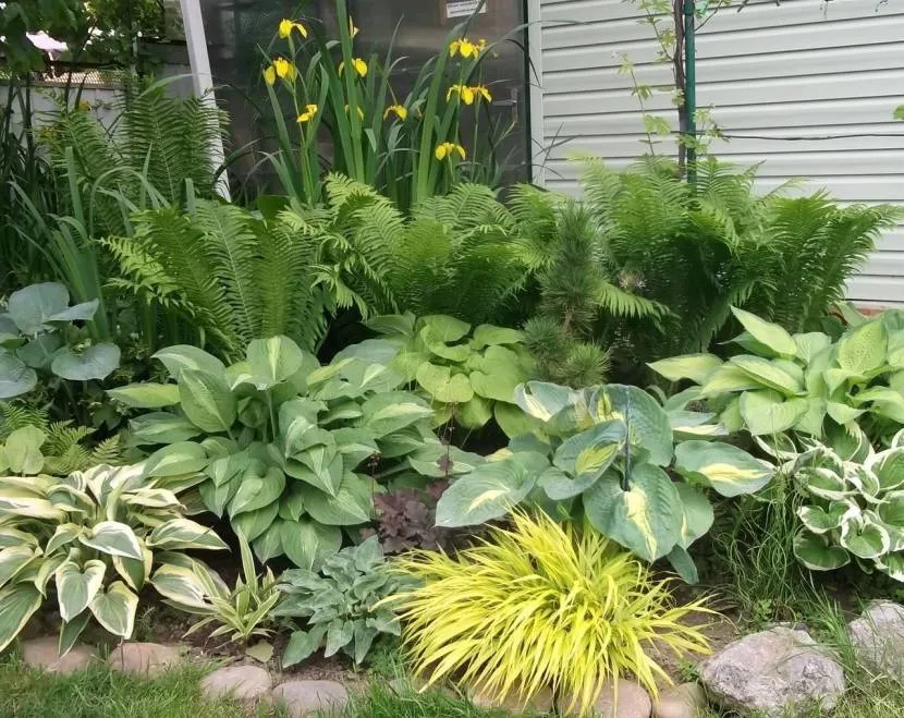Хосту можно сочетать с многолетними растениями, любящими тень:
