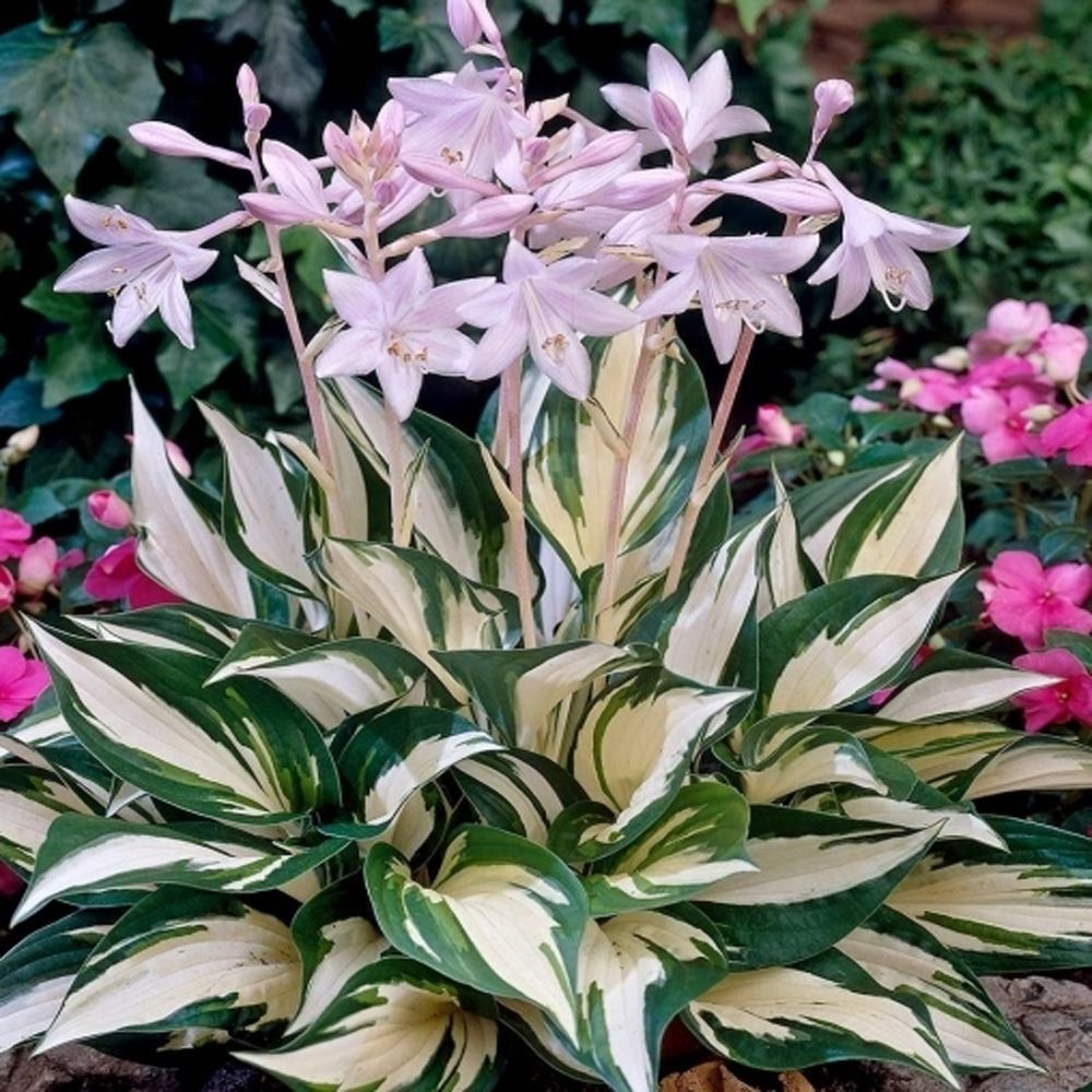 Эффектный многолетник, который способен придать яркий акцент любому цветнику. Высота кустиков составляет 45 – 60 см. и характерной чертой сорта является привлекательная окраска листовых пластин. Темно – зеленые и покрытые голубоватым налетом в центре листья окантованы белой, желтой или светло – зеленой широкой полоской по краю. В июле контрастом листьям будут служить нежные сиреневые бутоны.