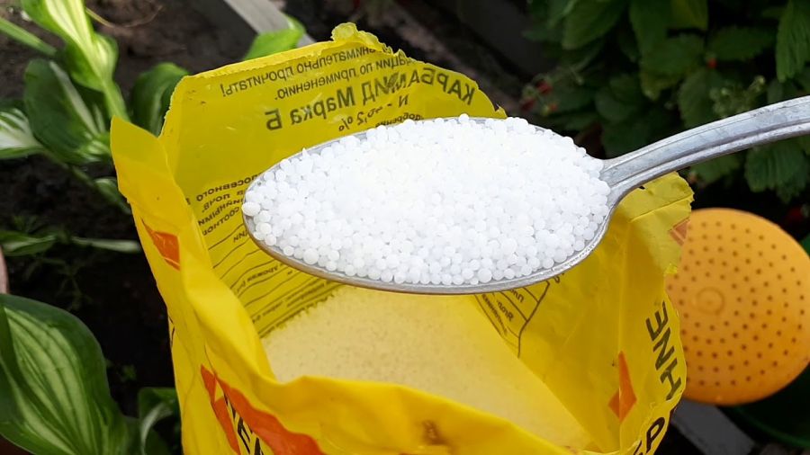 Весной после схода снега вносят азот — например, мочевину или аммиачную селитру по 10-15 г на 10 л. В начале лета растение удобряют 30-40 г суперфосфата и 30 г сернистого калия.