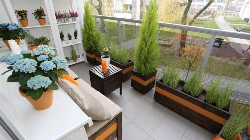 На балконе среднего размера доступны те же приёмы оформления, но с поправкой на имеющуюся площадь. На перила вывешивают лёгкие горшки, подставки выбирают более компактные, а на полу цветы удобнее всего расставлять вдоль стен и парапета в один ряд.