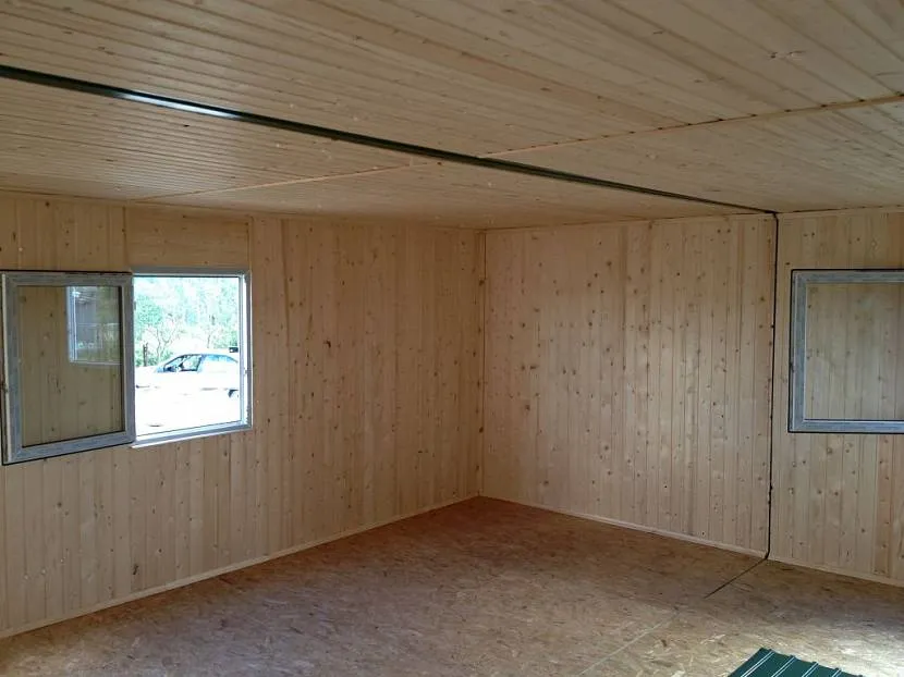 Если бытовка будет использоваться не как сторожка или хранилище, а как полноценное гостевое жилье, лучше использовать для обшивки деревянную вагонку. Стандартная вагонка класса «С» — это универсальный материал: доступный, прочный, легко поддающийся обработке.