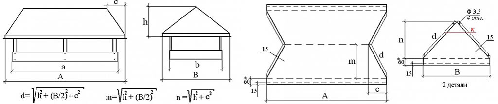 Процесс разработки и сборки дефлектора на вытяжную трубу состоит из четырех этапов: чертеж, создание заготовок, сборка, установка конструкции и ее закрепление непосредственно на дымоходе.