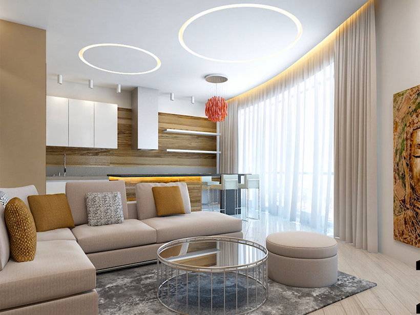 Потолки таких гостиных должны подчеркивать лаконичность интерьера, поэтому для их оформления используют однотонные материалы и краски. Эффектный прием — сочетание полос двух гармонично сочетающихся цветов.