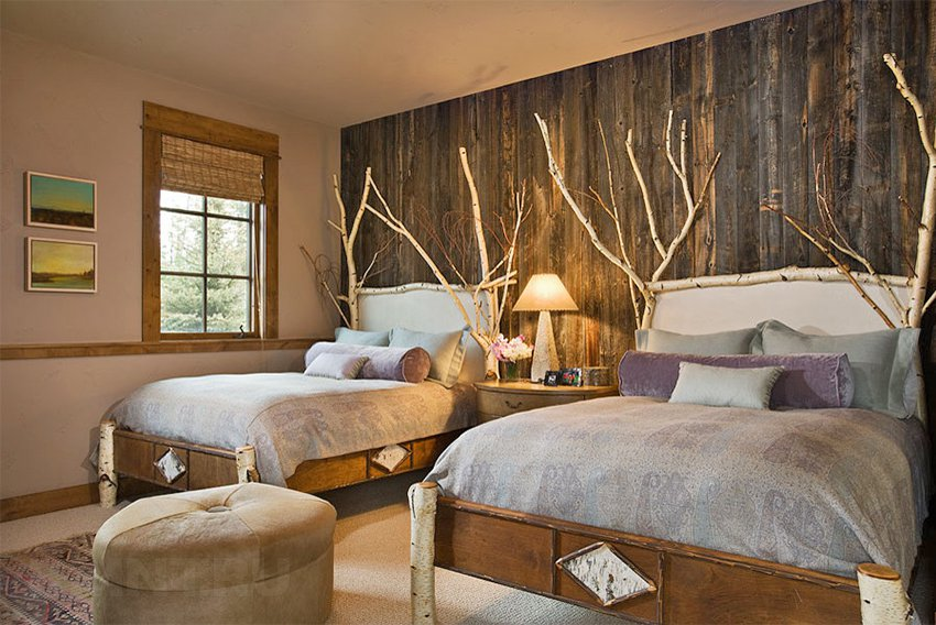 Необычное решение для оформления изголовья кровати. Тут использовано цельное, практически необработанное дерево