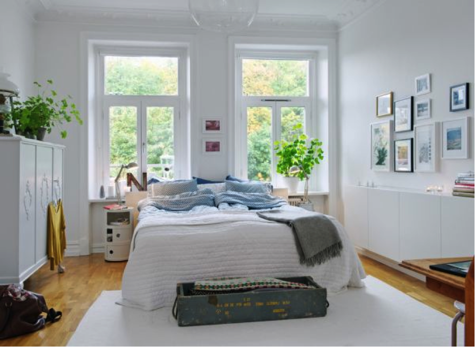 Скандинавскую спальню украсит декоративная стремянка, которую можно использовать как вешалку