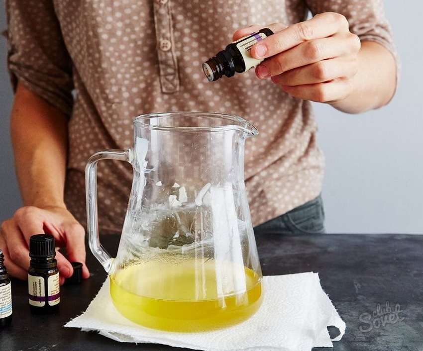 В остывший воск добавьте эфирные масла. Оптимальное соотношение аромата со свечной массой: 1 капля экстракта на 400 гр воска.