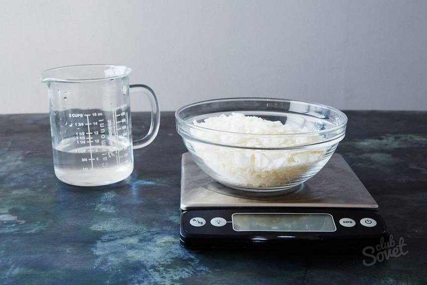 Взвесьте воду без учета емкости. Воск измельчите на терке или при помощи ножа. Старайтесь делать одинаковые куски, чтобы они плавились равномерно. В отдельную чашу переложите воск равный двойному весу жидкости.