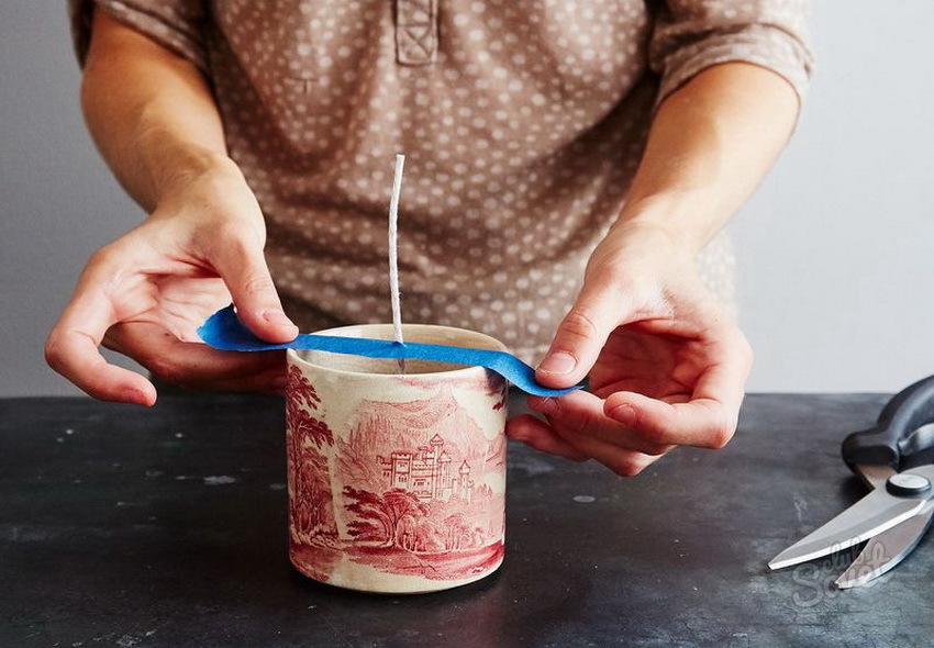 Когда воск полностью затвердеет, обрежьте фитиль до необходимого размера и уберите ленту.