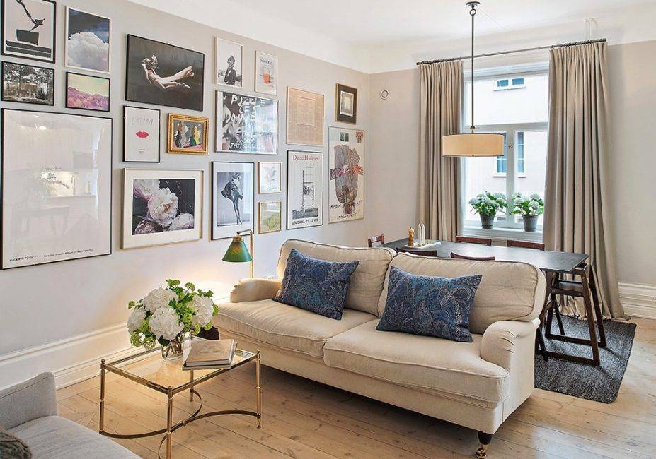 Декор стены небольшой гостиной с помощью металлических капель