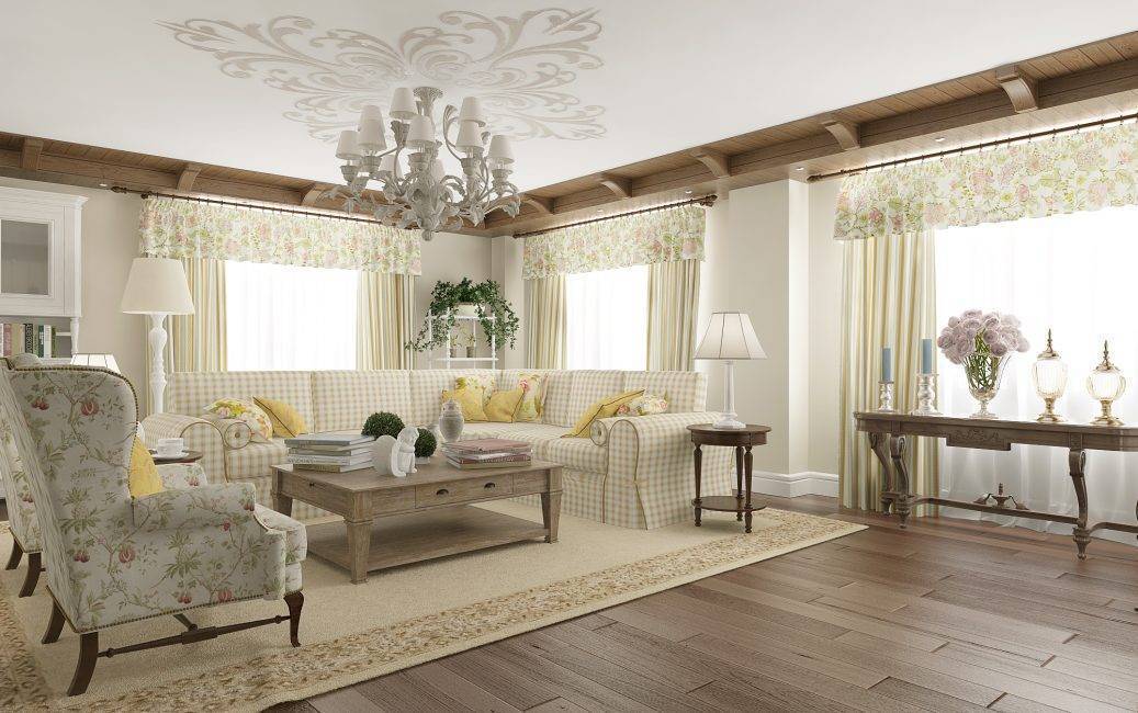Этот стиль относится к естественным. Для него характерна деревянная мебель и натуральные ткани, простота оформления в сочетании с природными оттенками. Здесь найдет свое место ручная роспись флористическими узорами, а также расцветки с характерной россыпью мелких цветочков.