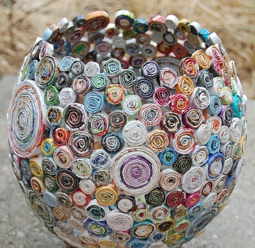 Можно найти другое применение газетным трубочкам. Наклеить картон на дно, а затем жгутами обвивать основу, формируя тело вазы. От наклона трубочек зависит форма изделия.