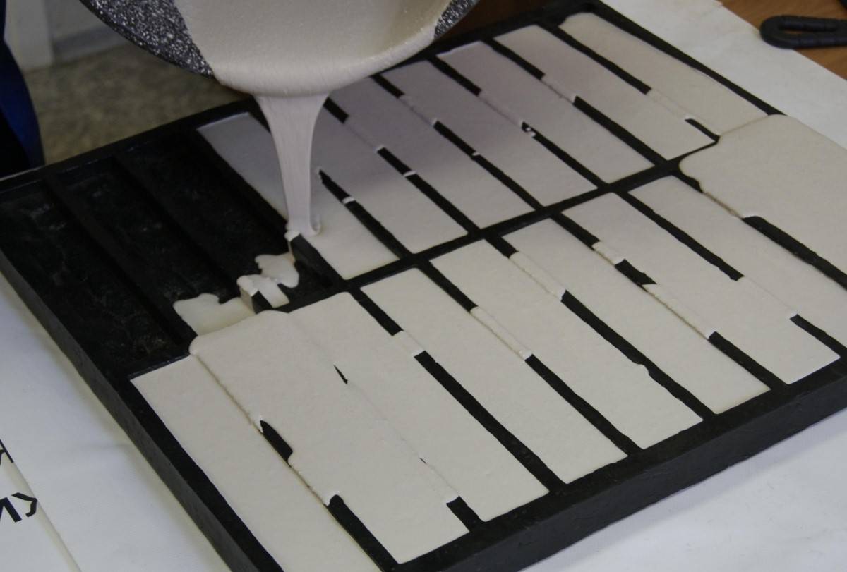 Разливать полученную массу можно лишь в сухие и чистые формы, выставленные в строго горизонтальном положении. Предварительно их обрабатывают материалом для предупреждения адгезии и гелькоутом и оставляют до затвердения. Идеально ровные плиты получаются, если раствор выливают небольшими частями, следя за тем, чтобы он равномерно заполнил ёмкость. Периодически формы нужно энергично встряхивать или устанавливать на вибрационный стол для удаления воздуха.