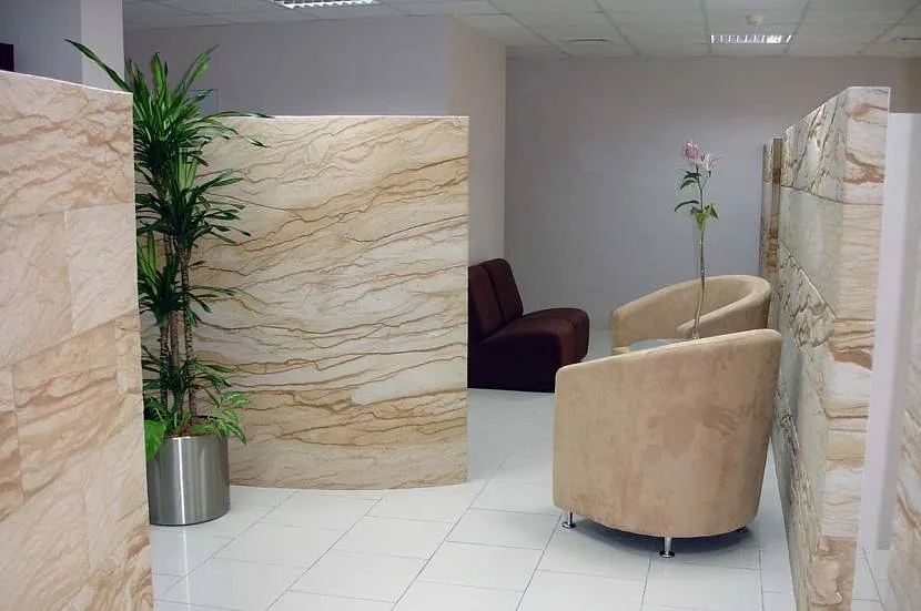 Такой вид камня создает видимость натурального, поэтому его часто используют дизайнеры. Он дешевле и проще монтируется на поверхность.