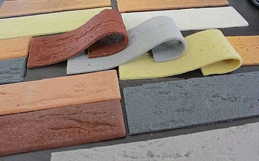 Гибкая плитка изготавливается из песчано-пигментных составов, нанесенных на эластичную основу. Материал обладает отличными эксплуатационными качествами и может использоваться во внутренних помещениях, на террасах или балконах. Весьма реалистично имитирует натуральную кирпичную поверхность. Используется как для полной облицовки стен, так и для частичного нанесения, образования точечных декоративных элементов.