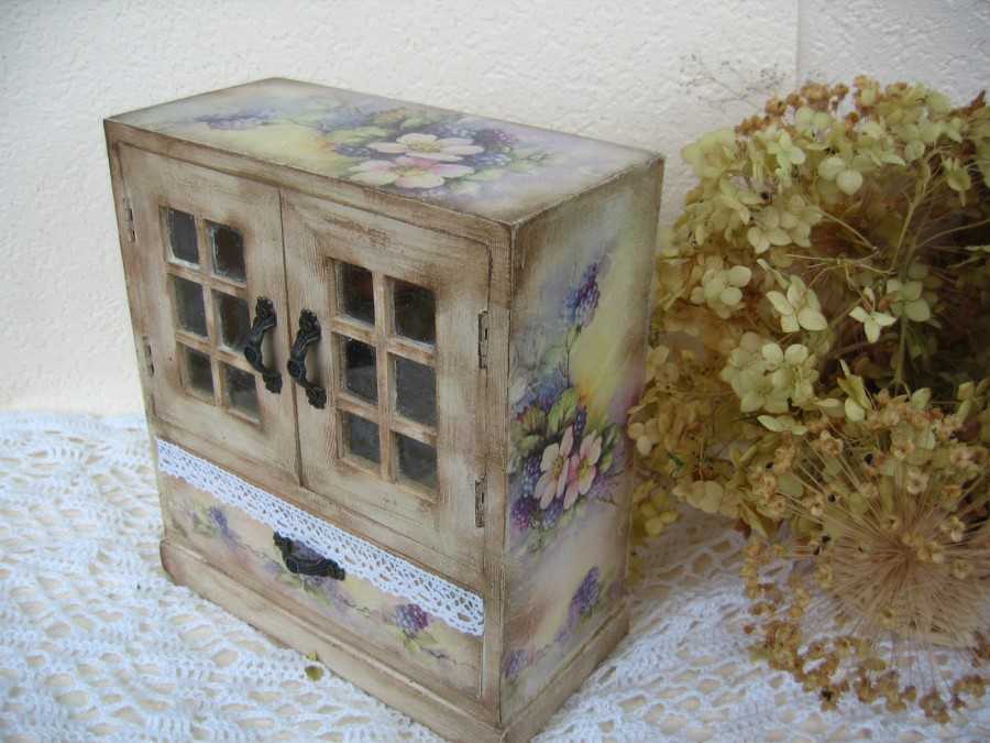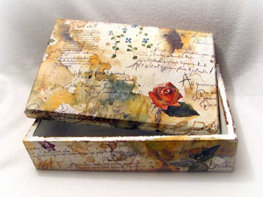 Декупаж позволяет декорировать неприглядную поверхность, создавая уникальные предметы. Винтажная шкатулка станет отличным выбором для подарка при минимуме финансовых возможностей, а материалы для изготовления найдутся в доме любой рукодельницы. В таком случае придется потратить немного времени для состаривания поверхности, но и здесь достаточно воспользоваться специальным кракелюрным лаком или проработать стыки мелкозернистой наждачной бумагой. Дополнительным элементом декора послужит полоска кружева на шкатулке, предварительно замоченная в чае или кофе.