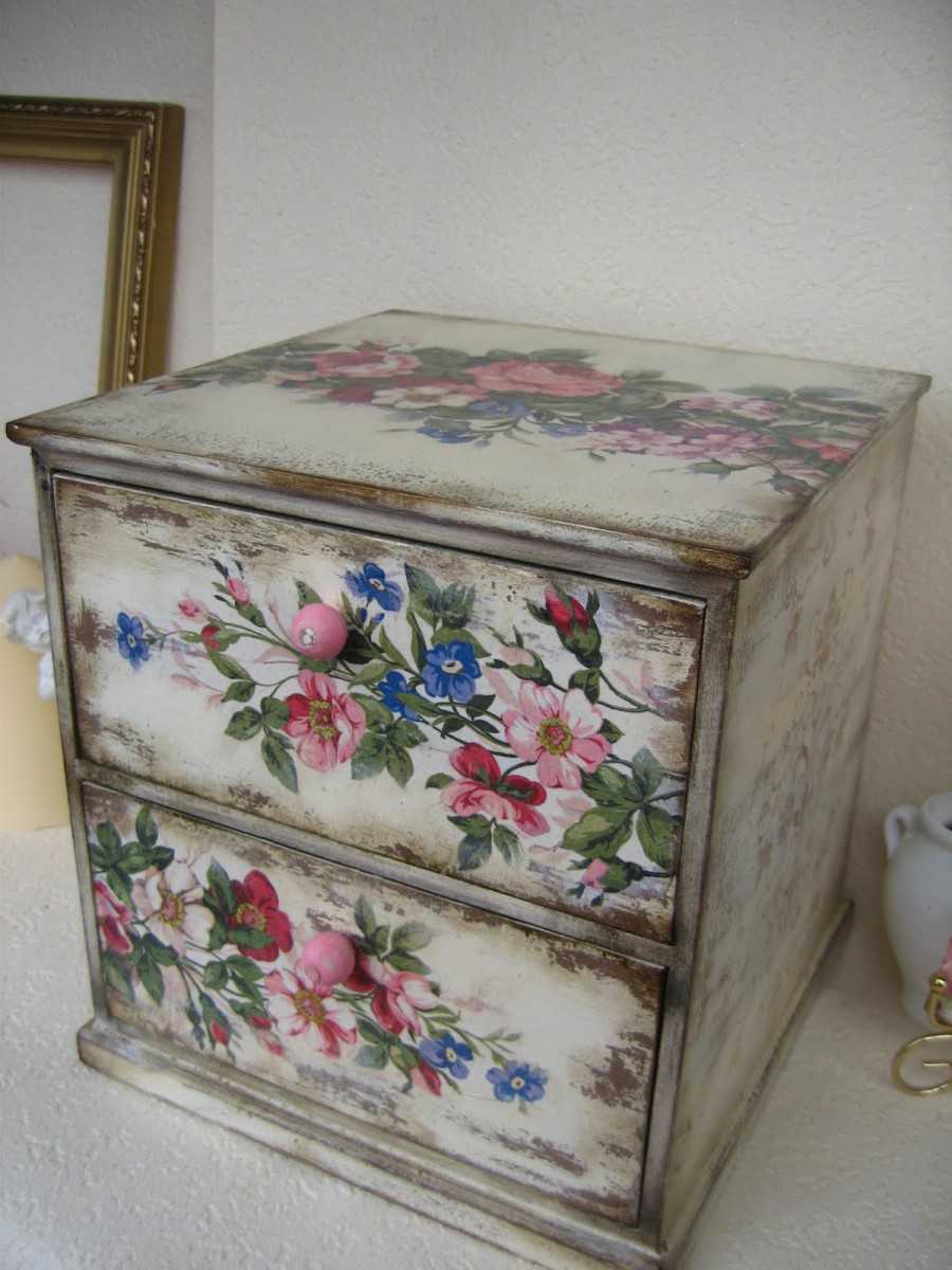 Создать эффект шебби помогает специальная техника, просто перекрасив шкатулки в белый цвет или нарисовав цветочные картинки, шика не добиться.