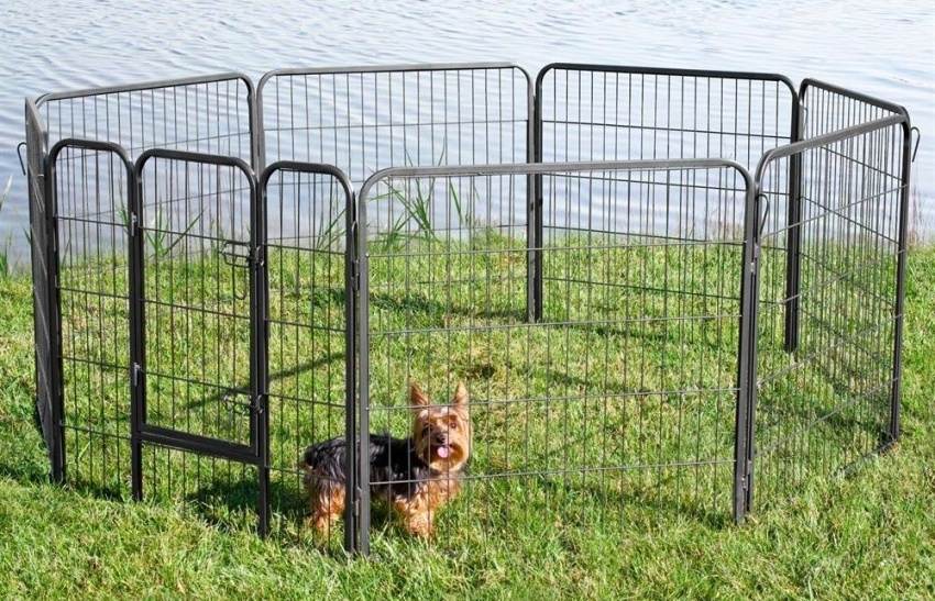 - Собака выросла и стала среднего размера. Стоит подобрать конструкцию металлическую или из дерева, с боковыми дверками и высотой стенок (обязательно) не ниже 80 см. Собака будет выходить через дверь, поскольку такая высота не позволит ей выпрыгивать наружу через ограждение.