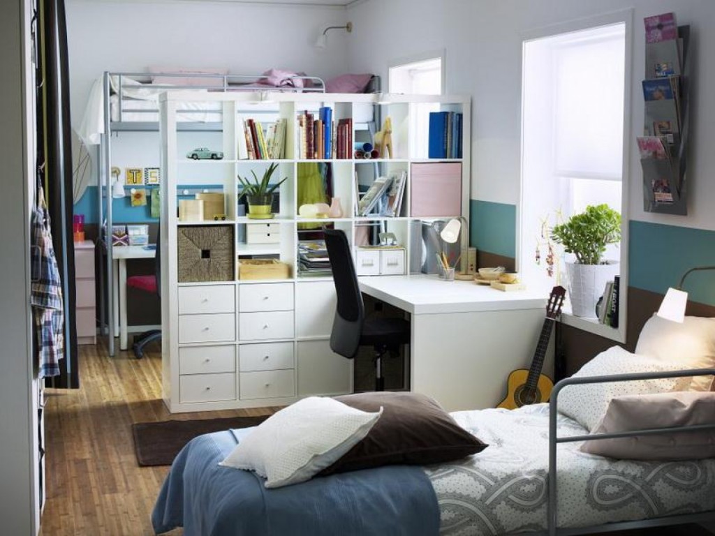 Можно создать двухъярусную комнату, где спальня располагается наверху. Однако это практически невозможно для хозяев современных тесных квартир, поэтому чаще выбирают двухъярусную кровать, которая позволяет сэкономить много места. Можно использовать раскладной диван или кресла.