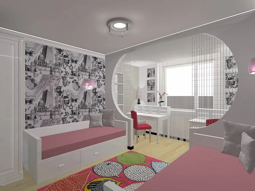 - Если размеры комнаты позволяют, то можно разделить пространство на зоны: уголок для переодевания с ширмой и зеркалом; кровать для сна и отдыха желательно отделить балдахином или шторами в виде нитей с бусинами; место для учёбы и творчества.