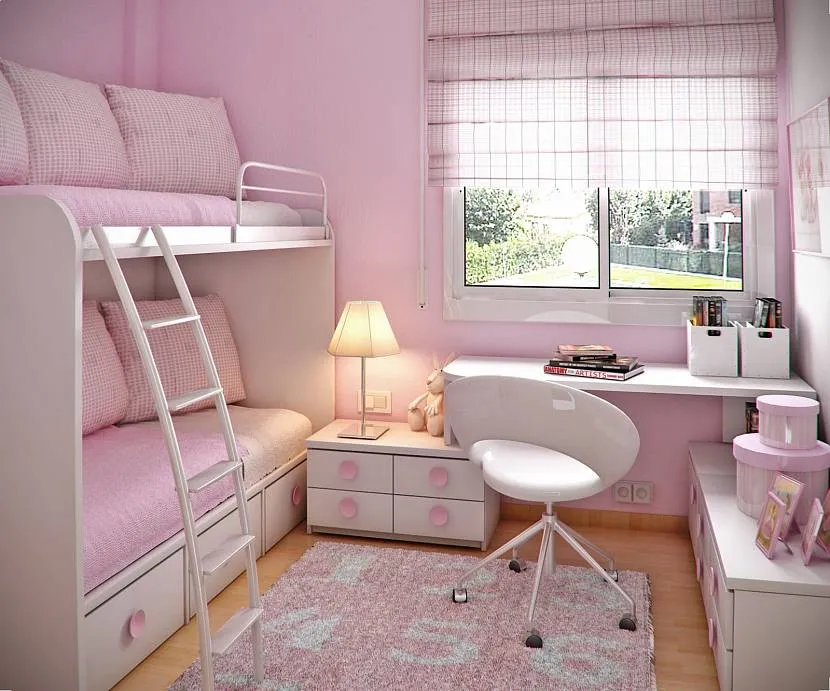 - Если в комнате будут находиться две девочки, то желательно для каждой оформить отдельное рабочее место и ящики для личных вещей. Практичнее и экономнее будет использовать двухъярусную кровать.