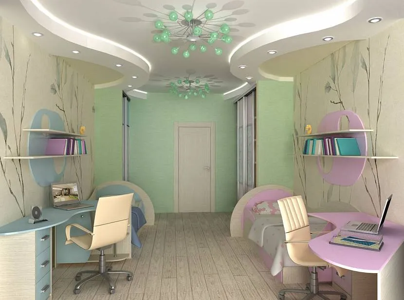 Подростковый интерьер двух девушек, предполагает различный декор, в виде постеров, фотографий и хэнд-мэйда, способствующего созданию самобытного дизайна. Для меблировки часто выбирают двухъярусные спальные места, подиумные кровати, откидные конструкции, модели-трансформеры, раскладывающиеся диваны, которые предоставляют комфортный отдых и сон.