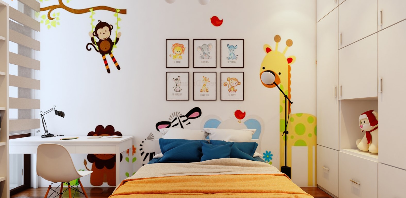 Стены в детской легко украсить постерами или наклейками-стикерами. Можно выбрать стикеры-животные, растения и создать с их помощью волшебный сад. А можно — фантазийные сценарии с героями мультфильмов.