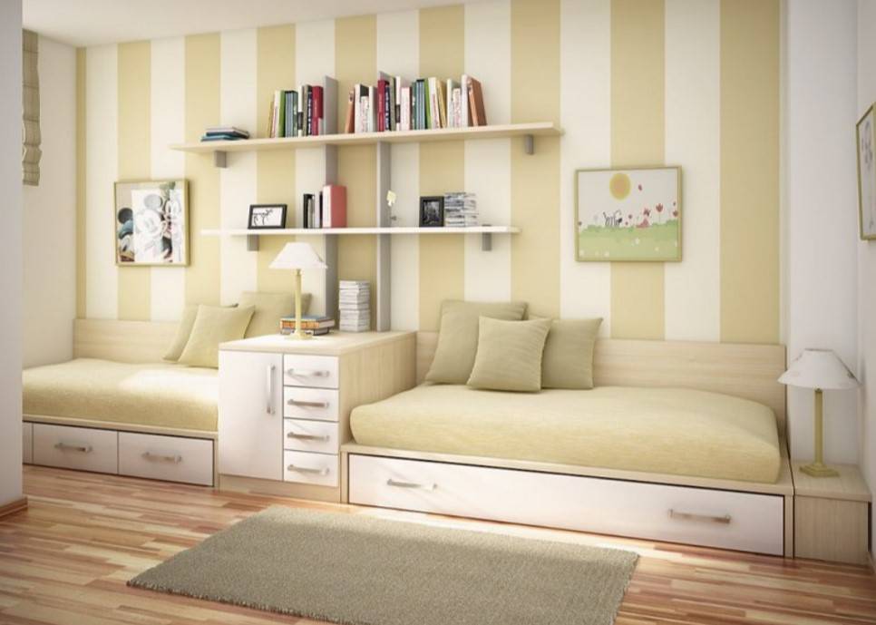В более миниатюрной комнате устанавливают две простые либо одну двухъярусную кровать. В рабочем уголке могут стоять два небольших стола, либо один широкий или раскладной стол, который при необходимости можно будет сложить обратно. Для сна можно использовать и раскладные кресла-кровати. Если для фона комнаты выбирался нейтральный оттенок, каждый ребёнок сможет украсить свою зону, как ему захочется, используя для этого личные вещи и настенный декор.