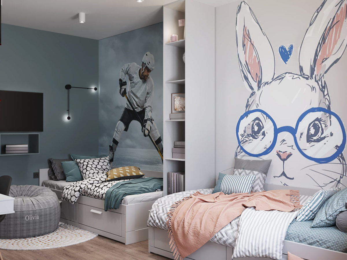 Родители должны уделить особое внимание месту для сна – это могут быть двухъярусные или обычные односпальные кровати, раздвижные модули или кресла-кровати. Стоит сразу делать комнату “на вырост”, так сказать сразу для подростков