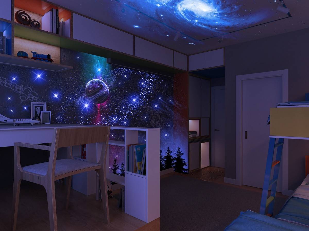 Украсить можно не только стены, но и потолок, например, нанести на него рисунок звёздного неба. Подвесные конструкции оживят интерьер.