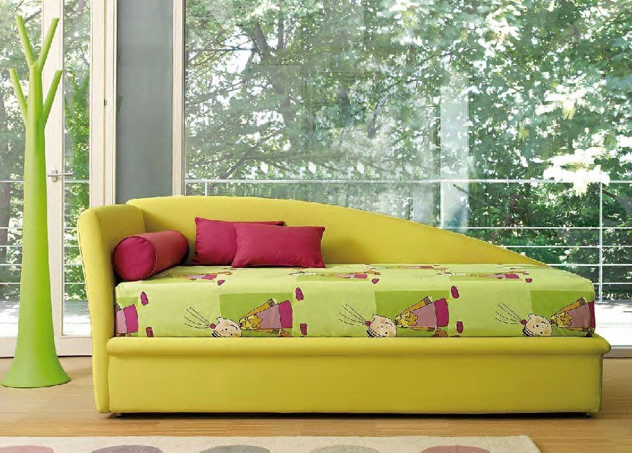 Помимо кроватей и диванов, производители мебели выпускают и прочие виды спальных мест для детей. Одним из таких видов является кушетка, которая представляет собой небольшой диванчик с низкой спинкой и изголовьем. Как правило, спальное место рассчитано на одного ребёнка и не оснащено устройством трансформации. Однако некоторые модели могут иметь ящики для хранения различных вещей. Детские кушетки с бортиками для малышей от 3 лет устанавливается на подиум или основание на деревянных или металлических ножках.