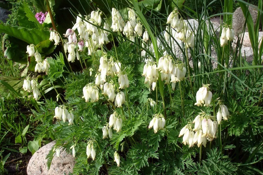 Дицентра сорта Альба не менее привлекательна. Обильное продолжительное цветение не может не порадовать садовода. Бутоны белого цвета с изящными линиями.