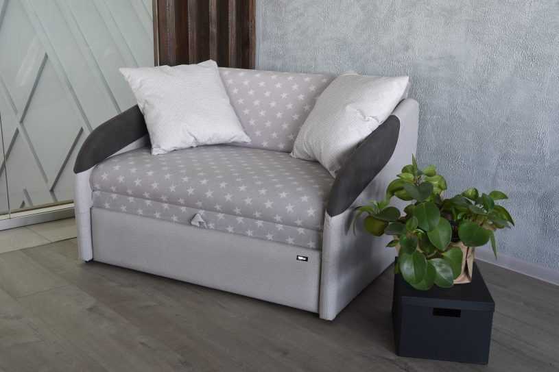 Небольшой диван с комбинированной обивкой разных цветов. Полутораспальный, ширина 120 см. Трансформация по типу «аккордеон».