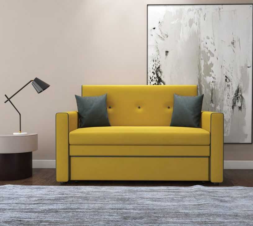 На фото спальня и желтый диван-кровать с механизмом аккордеон, оснащенный ящиком для пастельного белья.
