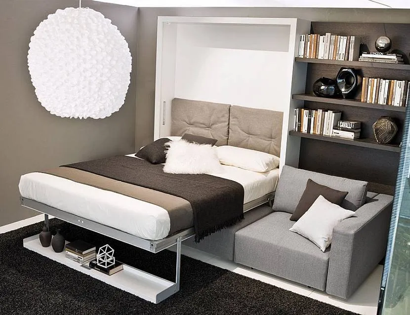 Но ситуаций в жизни множество. Поэтому и дизайнеры не дремлют и создают предметы мебели уже не 2 в 1, а три или даже четыре в одном. Не верите? Убедитесь сами – тот же диван разделён на две различные части. Розовые подушки на сером фоне – стильно и изысканно.