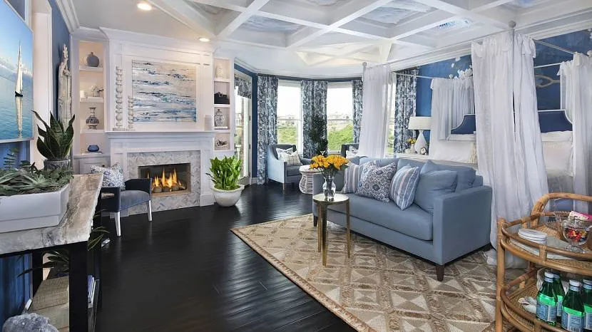 Для гостиной, в которой установлен камин (как правило, он располагается в центре одной из стен без окон), логично обустроить системы хранения по оби стороны от очага. Симметричное расположение открытых полок и распашных шкафчиков не только создаст вместительную систему хранения, но и привнесет в образ гостиной строгость, четкость и геометричность.