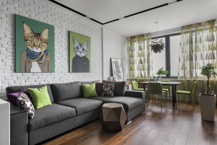 Задача усложняется, если оттоманка входит в набор с диваном или с диваном и двумя креслами. Пространства должно хватать для всех предметов; идеально, если Г-образную модель можно поставить не у стены, а ближе к центру комнаты. В квартире-студии мебель может стать элементом зонирования. В небольшой гостиной, где диван ставят вплотную к стене, уместно подумать о конструкции-трансформере.