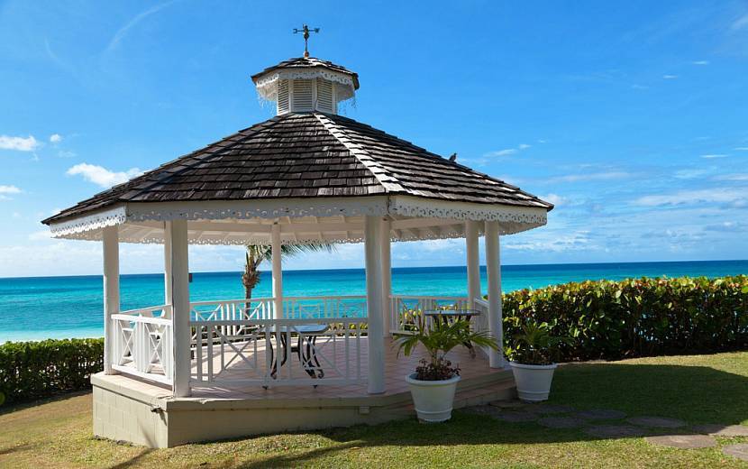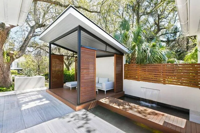 - Легкую, открытую конструкцию с дощатой оградой и полом, вымощенным ракушечником или плиткой. Стенами служат полупрозрачные шторы (например, из органзы) и сети. Для крыши подойдет мягкая черепица или натуральные материалы — тростник или солома.