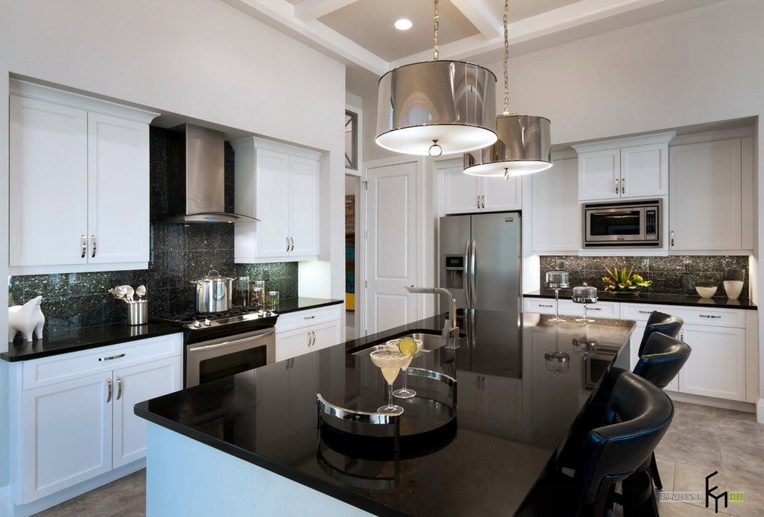На потолке, который допустимо сделать глянцево-черным, присутствует несколько точечных светильников, над столешницами, одна из которых – островная, размещают лампу на длинном шнурке.