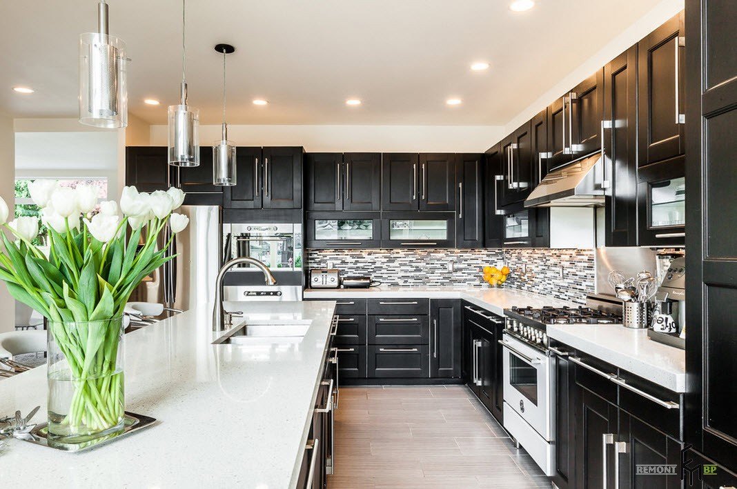 Зеркальные и стеклянные вставки в кухонных шкафчиках – прекрасная идея дизайнера, которая визуально облегчает восприятие темного цвета мебели. Мозаичная плитка разных оттенков стала изысканным и грамотным цветовым переходом между белыми стенами и темными шкафами.